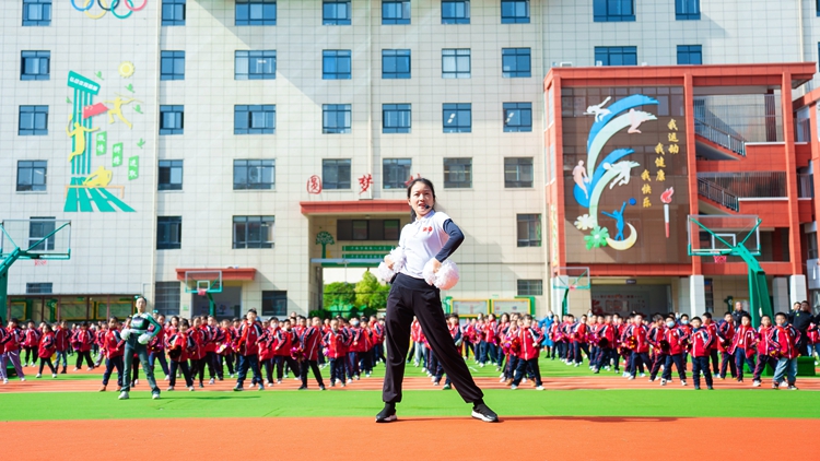 活動現(xiàn)場,體育教學研究部教師張馨嬌指導商州區(qū)第二小學學生及體育教師大課間花球啦啦操項目《刨冰進行曲》?,F(xiàn)場氣氛活躍,第二小學師生積極認真的模仿練習,充分展現(xiàn)出少年兒童的蓬勃朝氣和健康向上的團隊合作精神。