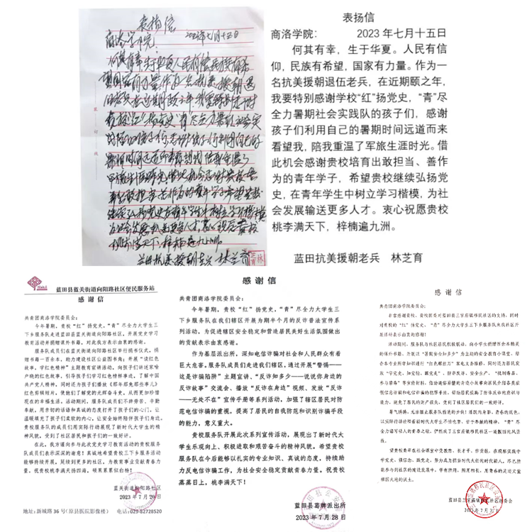 實踐活動扎實開展 社會團(tuán)體高度認(rèn)可。活動期間,實踐隊全體隊員工作準(zhǔn)備充分、實踐狀態(tài)積極、內(nèi)容豐富充實。向參與活動的社區(qū)居民、學(xué)生普及黨史知識,對其提升政治能力起到了明顯的促進(jìn)作用,受到當(dāng)?shù)孛癖姷囊恢潞迷u,收到了來自抗美援朝老兵林芝育手寫表揚信1封和來自藍(lán)關(guān)街道向陽路社區(qū)、葛牌派出所、三官廟移民社區(qū)感謝信3封,字里行間承載了受訪者和實踐單位對電信學(xué)院"紅"揚黨史,“青”盡全力社會實踐隊的感謝和認(rèn)可。