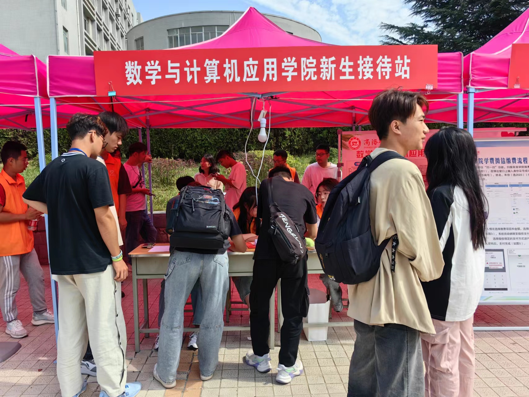 團建聚力,熱情接待。院團總支接到學院黨委部署后及時召開團總支委員會會議,商定迎新具體安排。新生報到前,在8號樓及田徑場外圍懸掛迎新橫幅,在報到點安置院情展板,營造濃烈迎新氛圍;新生報到期間,身著橙色馬甲的數(shù)計學院志愿者們有序引導新生辦理報到手續(xù),幫助他們搬運行李、安排住宿并耐心地介紹校情院況,讓新生們感受到了來自學長學姐們的熱情和愛護。