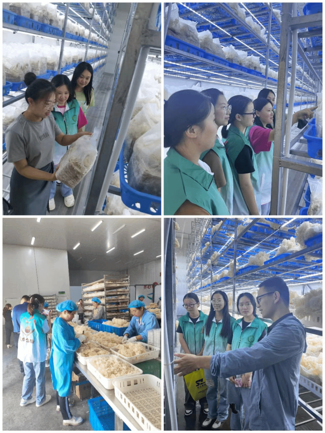 團(tuán)隊(duì)一行參觀了繡球菌工廠內(nèi)裝拌、凈化、接種、培養(yǎng)、出菇、采摘、包裝等車間。在參觀過(guò)程中,教師及繡球菌工廠負(fù)責(zé)人詳細(xì)地為學(xué)生們講解各個(gè)車間主要的工作任務(wù)、生產(chǎn)原理、儀器設(shè)備、操作要點(diǎn)、人員配置及車間整體規(guī)劃布置和企業(yè)經(jīng)營(yíng)理念,幫助學(xué)生深入了解繡球菌的生產(chǎn)加工工藝流程。此外,在繡球菌的培養(yǎng)及包裝車間內(nèi),學(xué)生通過(guò)親身實(shí)踐加深了對(duì)繡球菌生產(chǎn)工藝的認(rèn)識(shí),紛紛表示受益匪淺。