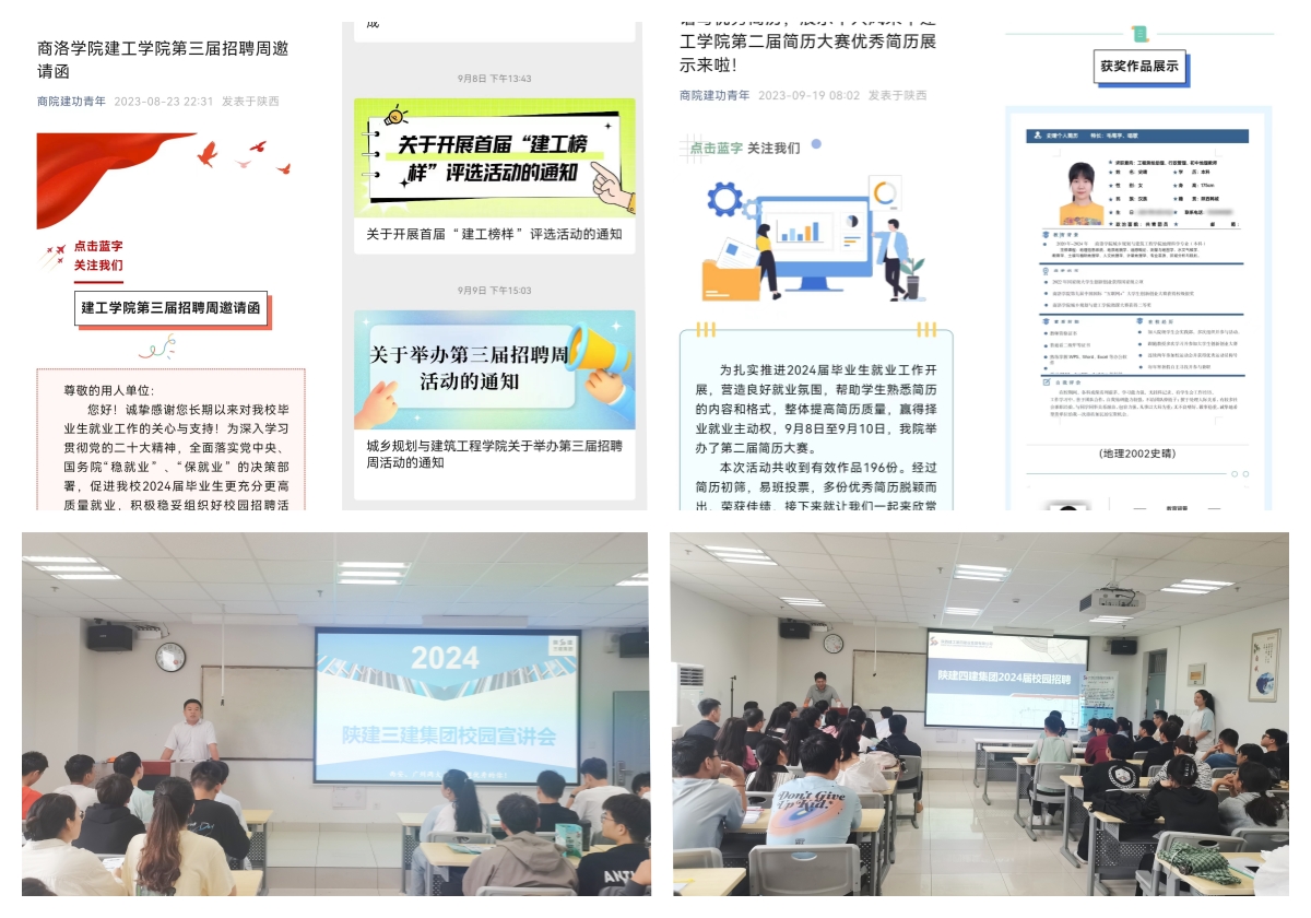 早謀劃,做好就業(yè)動(dòng)員與幫扶。7月10日,建工學(xué)院成立了以學(xué)院黨委書記楊小鋒為組長(zhǎng)的2024屆就業(yè)工作專班,制定工作方案,明確責(zé)任目標(biāo),在分析研判建筑類行業(yè)需求情況的基礎(chǔ)上,一是設(shè)計(jì)和發(fā)布建工學(xué)院第三屆招聘周邀請(qǐng)函,主動(dòng)邀請(qǐng)社會(huì)用人單位進(jìn)校召開宣講會(huì);二是分專業(yè)分學(xué)制做好全體畢業(yè)生就業(yè)意向調(diào)查數(shù)據(jù)采集,明確就業(yè)方向;三是召開2024屆畢業(yè)生就業(yè)動(dòng)員會(huì),所有畢業(yè)班輔導(dǎo)員及班主任及時(shí)進(jìn)班召開就業(yè)主題班會(huì),從建筑類專業(yè)就業(yè)形勢(shì)特點(diǎn)、樹立正確的就業(yè)觀念、求職準(zhǔn)備、心理輔導(dǎo)、就業(yè)安全等幾個(gè)方面為畢業(yè)生解答疑惑;四是建立家庭經(jīng)濟(jì)和就業(yè)困難畢業(yè)生幫扶臺(tái)賬,成立幫扶小組,學(xué)院班子成員主動(dòng)帶頭聯(lián)系幫扶,主動(dòng)開展就業(yè)助推暖心服務(wù);五是同步舉辦第三屆簡(jiǎn)歷設(shè)計(jì)大賽,以賽促就業(yè),196名畢業(yè)生提交簡(jiǎn)歷,評(píng)選出10份優(yōu)秀簡(jiǎn)歷進(jìn)行展示,引導(dǎo)學(xué)生設(shè)計(jì)完善簡(jiǎn)歷為參加招聘宣講會(huì)做充分準(zhǔn)備;六是教師主動(dòng)幫扶學(xué)生做好職業(yè)規(guī)劃,城鄉(xiāng)規(guī)劃專業(yè)馬驍?shù)壤蠋熤鲃?dòng)指導(dǎo)學(xué)生設(shè)計(jì)簡(jiǎn)歷、開展學(xué)生面試應(yīng)聘模擬等,助力學(xué)生早就業(yè)。