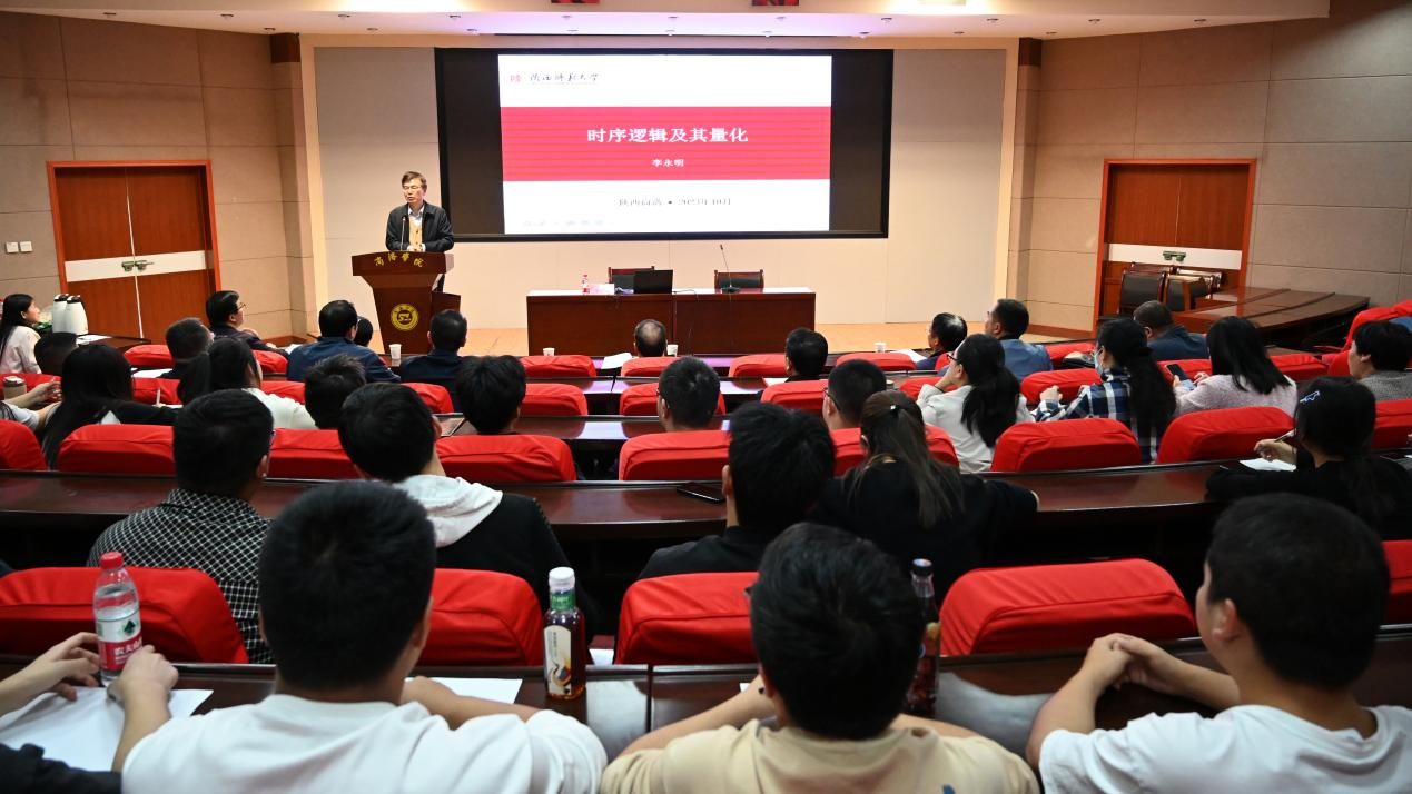 10月13日,數(shù)計學(xué)院邀請我??妥淌?、陜西師范大學(xué)博士生導(dǎo)師李永明教授來校作題為《時序邏輯及其量化》的學(xué)術(shù)報告。學(xué)院全體教師及80余名學(xué)生代表參加了報告會。報告會由數(shù)計學(xué)院副院長李會榮主持。