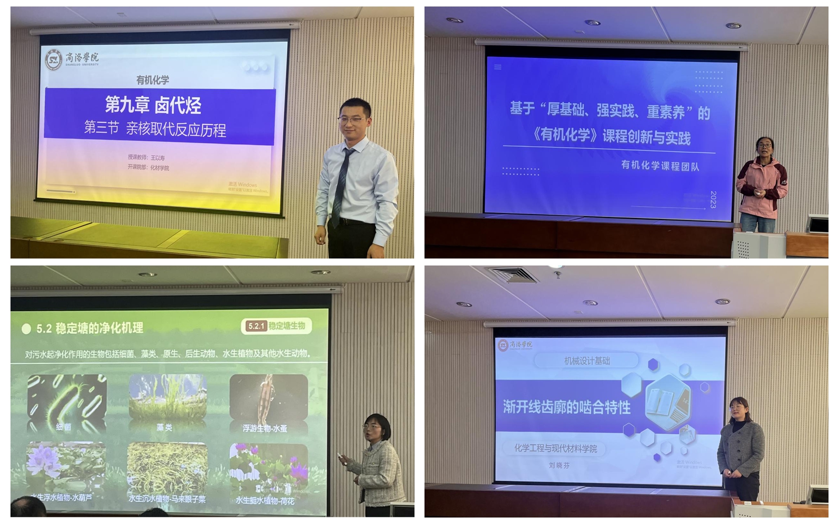 商洛學(xué)院青年教師教學(xué)技能競(jìng)賽一等獎(jiǎng)獲得者徐珊、商洛學(xué)院課程思政教學(xué)標(biāo)兵劉曉芬、商洛學(xué)院課堂教學(xué)創(chuàng)新大賽一等獎(jiǎng)王香婷、商洛學(xué)院青年教師教學(xué)技能競(jìng)賽二等獎(jiǎng)、課程思政教學(xué)骨干王以壽分別以《基于“厚基礎(chǔ)、強(qiáng)實(shí)踐、重素養(yǎng)”的<有機(jī)化學(xué)>課程創(chuàng)新與實(shí)踐》《穩(wěn)定化塘——凈化機(jī)理》《漸開(kāi)線齒廓的嚙合特性》《親核取代反應(yīng)歷程》為題作了示范課講授,并分享了自身教學(xué)技巧和教學(xué)設(shè)計(jì)經(jīng)驗(yàn)。