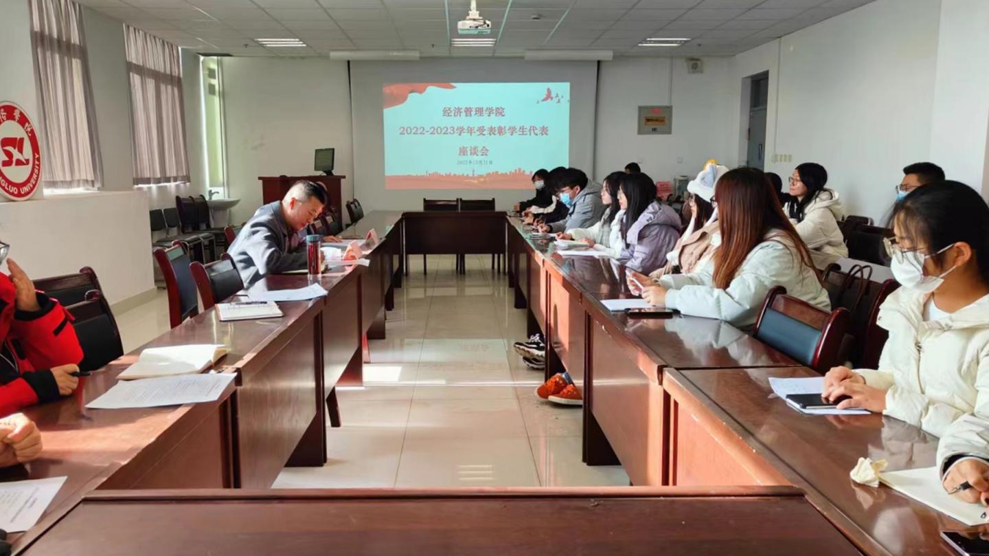 為表彰先進(jìn),樹立榜樣,營造比學(xué)趕超的良好氛圍,12月21日,經(jīng)濟(jì)管理學(xué)院組織召開2022-2023學(xué)年受表彰學(xué)生代表座談會(huì)。學(xué)院黨政領(lǐng)導(dǎo),全體輔導(dǎo)員和2022-2023學(xué)年榮獲三好學(xué)生、優(yōu)秀學(xué)生干部、十佳大學(xué)生、先進(jìn)班集體的學(xué)生代表30余人參加會(huì)議。會(huì)議由學(xué)院黨委書記高擴(kuò)昌主持。