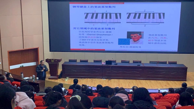 張勝貴教授以《斐波那契數(shù)列》為題,從數(shù)列的來源、與黃金分割的關(guān)系和應(yīng)用等方面,完整、詳細(xì)地介紹了斐波那契數(shù)列。整場(chǎng)報(bào)告深入淺出,與會(huì)師生共同體驗(yàn)斐波那契數(shù)列的美與價(jià)值。