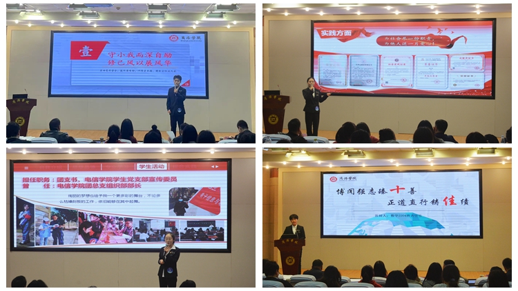 團委書記王姍、教務(wù)處副處長王欣分別對初評對象的出色表現(xiàn)給予了充分肯定,結(jié)合各個初評對象的展示內(nèi)容進行了點評,并鼓勵大家要繼續(xù)發(fā)揮榜樣作用,激勵和帶動更多同學(xué)不斷完善自我、勇于創(chuàng)新,努力成為更優(yōu)秀的自己。