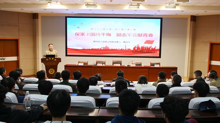 高運(yùn)鋒結(jié)合個(gè)人軍旅生涯現(xiàn)身說法,以《立志參軍 精忠報(bào)國》為題,從入伍優(yōu)待政策、參軍入伍要求、應(yīng)征入伍流程三個(gè)方面就征兵工作有關(guān)政策進(jìn)行了全面解讀。他勉勵(lì)同學(xué)們要牢固樹立“保家衛(wèi)國終不悔,勵(lì)志軍營獻(xiàn)青春”的意志,刻苦努力、認(rèn)真學(xué)習(xí),用實(shí)際行動(dòng)為“中國夢 強(qiáng)軍夢”貢獻(xiàn)個(gè)人力量。