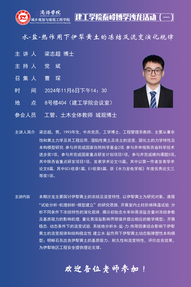 在首場活動中工程管理系梁志超博士進(jìn)行了“水-鹽-熱作用下伊犁黃土的凍結(jié)及流變演化規(guī)律”的主題發(fā)言,梁志超分別從研究支撐條件、研究背景、研究成果及未來展望四個(gè)方面對水-鹽-熱作用下伊利黃土的凍結(jié)及流變演化規(guī)律進(jìn)行了分享。針對梁志超的研究內(nèi)容,米文靜和劉國棟兩位博士分別進(jìn)行了交流發(fā)言,其余老師也積極交流、討論。同時(shí),老師們結(jié)合近期個(gè)人在閱讀文獻(xiàn)、撰寫論文、投稿、申報(bào)項(xiàng)目、在研項(xiàng)目中存在的問題和所思所想進(jìn)行交流。學(xué)術(shù)活動氛圍非?;钴S、輕松。