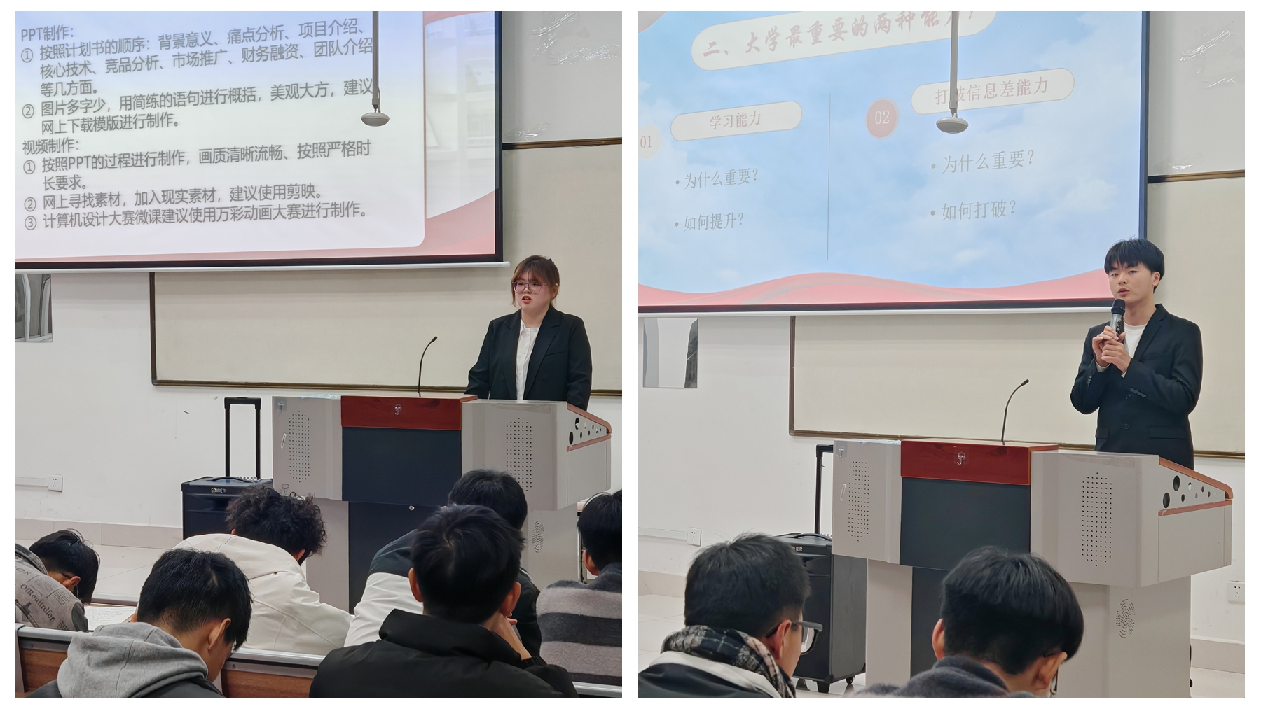 國家獎學(xué)金獲得者衛(wèi)健茹、十佳大學(xué)生吝佳樂分別結(jié)合自身全面發(fā)展的經(jīng)驗(yàn),為新生們提供了如何在學(xué)習(xí)、競賽、社團(tuán)活動等多方面平衡兼顧并取得優(yōu)異成績的思路與方法。他們在講述中流露出來的對學(xué)習(xí)的熱愛和專注深深感染了在場新生。