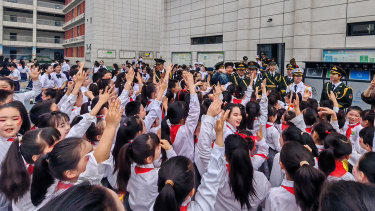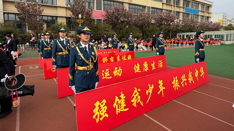 當日上午,在附屬小學(xué)操場舉行的運動會開幕式上,國旗護衛(wèi)隊隊員身著禮賓服,肩扛五星紅旗,步調(diào)鏗鏘有力,從操場一側(cè)莊嚴護送國旗入場。隨著指揮員口令下達,現(xiàn)場奏響《義勇軍進行曲》,五星紅旗冉冉升起,全場師生行注目禮。升旗儀式結(jié)束后,國旗護衛(wèi)隊隊員與部分小學(xué)生進行了現(xiàn)場互動,隊員就禮賓服配飾、隊列口令等內(nèi)容解答學(xué)生提問,并指導(dǎo)少先隊禮的規(guī)范動作。