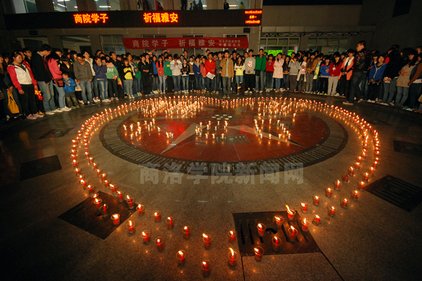 4月22日晚。我校學(xué)生自發(fā)組織祈福活動(dòng),為“4·20”雅安地震中遇難的同胞默哀,為災(zāi)區(qū)人民祈福