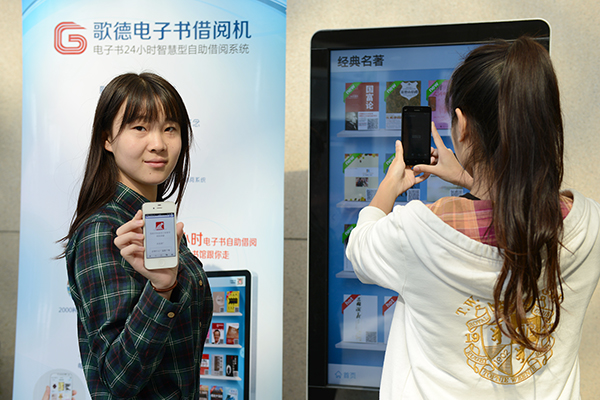 近日,記者看到我校圖書館大廳看到了一部“大手機(jī)”,不少讀者拿手機(jī)在屏幕上翻閱掃描