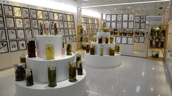 標(biāo)本陳列室保存有自1979年以來收藏的植物蠟葉標(biāo)本近9000份,植物浸制標(biāo)本130份,土壤剖面標(biāo)本18份,五大水系水樣15份,中藥材飲片標(biāo)本480份。其中不僅有野生葛根、巨型野靈芝、杜仲等名貴藥用植物,也包含了享譽(yù)中外的多種地道商洛藥材——丹參、桔梗、連翹、黃芩、五味子、金銀花、山茱萸、黃姜等。